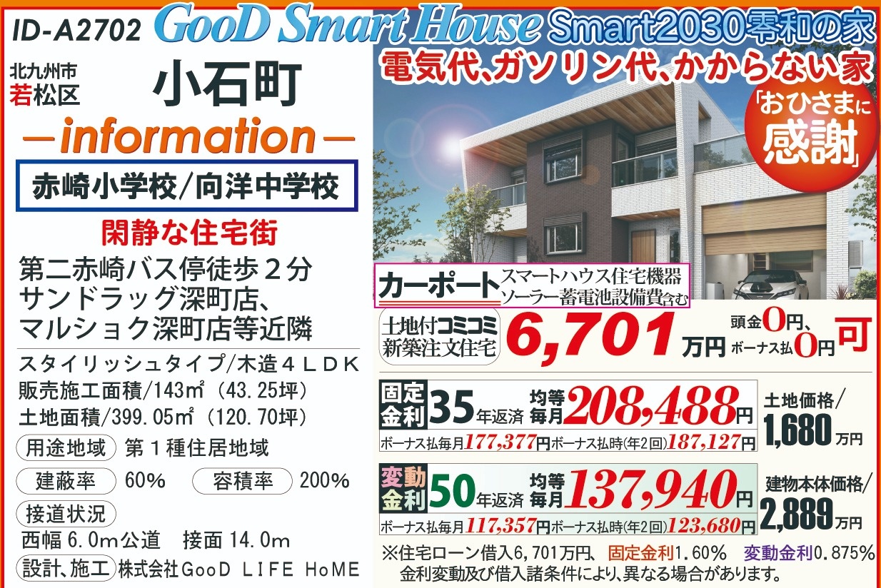 A2702小石町、スマートハウス202511 こだわり条件 エリア 価格 校区 新エネルギーシステム住宅 北九州市若松区 6,701万円 赤崎小 向洋中 【販売概要】土地+建物本体+ご提案住宅機器+敷地内上下水道工事+旧住宅基本解体工事+設計確認申請交付+消費税+さらに、オール電化+エコ給湯+ペアサッシ+高気密&高断熱+高耐震+GOODデザイン[含まれて無い物]外構工事+土木擁壁工事+敷地外給排水工事+銀行経費+登記費用+火災保険 この物件について問い合わせ 資料請求・ご質問等ございましたら、お気軽にお問い合わせください。 お名前必須 メールアドレス必須 お電話番号必須 ご住所必須 郵便番号 都道府県 都道府県 北海道 青森県 岩手県 宮城県 秋田県 山形県 福島県 茨城県 栃木県 群馬県 埼玉県 千葉県 東京都 神奈川県 新潟県 富山県 石川県 福井県 山梨県 長野県 岐阜県 静岡県 愛知県 三重県 滋賀県 京都府 大阪府 兵庫県 奈良県 和歌山県 鳥取県 島根県 岡山県 広島県 山口県 徳島県 香川県 愛媛県 高知県 福岡県 佐賀県 長崎県 熊本県 大分県 宮崎県 鹿児島県 沖縄県 市区町村、番地 建物名 郵便番号が入力されていません。 都道府県が選択されていません。 市区町村、番地が入力されていません。 お問い合わせ内容必須