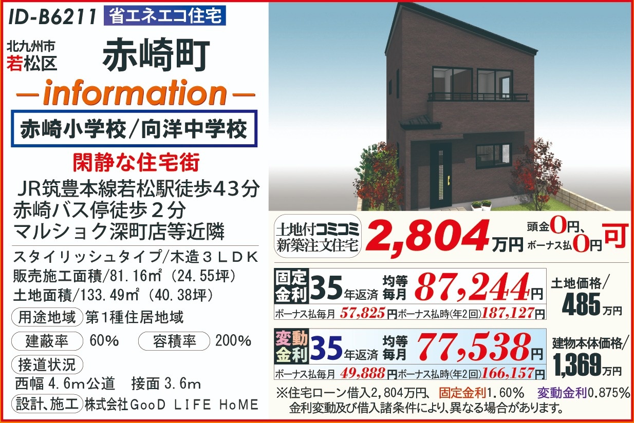 B6211赤崎町202511 こだわり条件 エリア 価格 校区 20代からの家づくり 北九州市若松区 2,804万円 赤崎小 向洋中 【販売概要】土地+建物本体+ご提案住宅機器+敷地内上下水道工事+旧住宅基本解体工事+設計確認申請交付+消費税+さらに、オール電化+エコ給湯+ペアサッシ+高気密&高断熱+高耐震+GOODデザイン[含まれて無い物]外構工事+土木擁壁工事+敷地外給排水工事+銀行経費+登記費用+火災保険 この物件について問い合わせ 資料請求・ご質問等ございましたら、お気軽にお問い合わせください。 お名前必須 メールアドレス必須 お電話番号必須 ご住所必須 郵便番号 都道府県 都道府県 北海道 青森県 岩手県 宮城県 秋田県 山形県 福島県 茨城県 栃木県 群馬県 埼玉県 千葉県 東京都 神奈川県 新潟県 富山県 石川県 福井県 山梨県 長野県 岐阜県 静岡県 愛知県 三重県 滋賀県 京都府 大阪府 兵庫県 奈良県 和歌山県 鳥取県 島根県 岡山県 広島県 山口県 徳島県 香川県 愛媛県 高知県 福岡県 佐賀県 長崎県 熊本県 大分県 宮崎県 鹿児島県 沖縄県 市区町村、番地 建物名 郵便番号が入力されていません。 都道府県が選択されていません。 市区町村、番地が入力されていません。 お問い合わせ内容必須