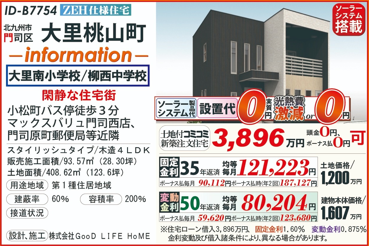 ID-B7754大里桃山町、ZEH太陽光202511 こだわり条件 エリア 価格 校区 新エネルギーシステム住宅 北九州市門司区 3,896万円 大里南小 柳西中 【販売概要】土地+建物本体+ご提案住宅機器+敷地内上下水道工事+旧住宅基本解体工事+設計確認申請交付+消費税+さらに、オール電化+エコ給湯+ペアサッシ+高気密&高断熱+高耐震+GOODデザイン[含まれて無い物]外構工事+土木擁壁工事+敷地外給排水工事+銀行経費+登記費用+火災保険 この物件について問い合わせ 資料請求・ご質問等ございましたら、お気軽にお問い合わせください。 お名前必須 メールアドレス必須 お電話番号必須 ご住所必須 郵便番号 都道府県 都道府県 北海道 青森県 岩手県 宮城県 秋田県 山形県 福島県 茨城県 栃木県 群馬県 埼玉県 千葉県 東京都 神奈川県 新潟県 富山県 石川県 福井県 山梨県 長野県 岐阜県 静岡県 愛知県 三重県 滋賀県 京都府 大阪府 兵庫県 奈良県 和歌山県 鳥取県 島根県 岡山県 広島県 山口県 徳島県 香川県 愛媛県 高知県 福岡県 佐賀県 長崎県 熊本県 大分県 宮崎県 鹿児島県 沖縄県 市区町村、番地 建物名 郵便番号が入力されていません。 都道府県が選択されていません。 市区町村、番地が入力されていません。 お問い合わせ内容必須