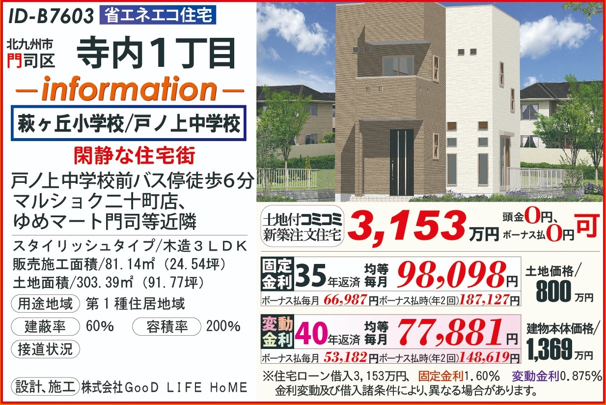 B7603寺内1丁目202511 こだわり条件 エリア 価格 校区 20代からの家づくり 北九州市門司区 3,153万円 萩ヶ丘小 戸ノ上中 【販売概要】土地+建物本体+ご提案住宅機器+敷地内上下水道工事+旧住宅基本解体工事+設計確認申請交付+消費税+さらに、オール電化+エコ給湯+ペアサッシ+高気密&高断熱+高耐震+GOODデザイン[含まれて無い物]外構工事+土木擁壁工事+敷地外給排水工事+銀行経費+登記費用+火災保険 この物件について問い合わせ 資料請求・ご質問等ございましたら、お気軽にお問い合わせください。 お名前必須 メールアドレス必須 お電話番号必須 ご住所必須 郵便番号 都道府県 都道府県 北海道 青森県 岩手県 宮城県 秋田県 山形県 福島県 茨城県 栃木県 群馬県 埼玉県 千葉県 東京都 神奈川県 新潟県 富山県 石川県 福井県 山梨県 長野県 岐阜県 静岡県 愛知県 三重県 滋賀県 京都府 大阪府 兵庫県 奈良県 和歌山県 鳥取県 島根県 岡山県 広島県 山口県 徳島県 香川県 愛媛県 高知県 福岡県 佐賀県 長崎県 熊本県 大分県 宮崎県 鹿児島県 沖縄県 市区町村、番地 建物名 郵便番号が入力されていません。 都道府県が選択されていません。 市区町村、番地が入力されていません。 お問い合わせ内容必須