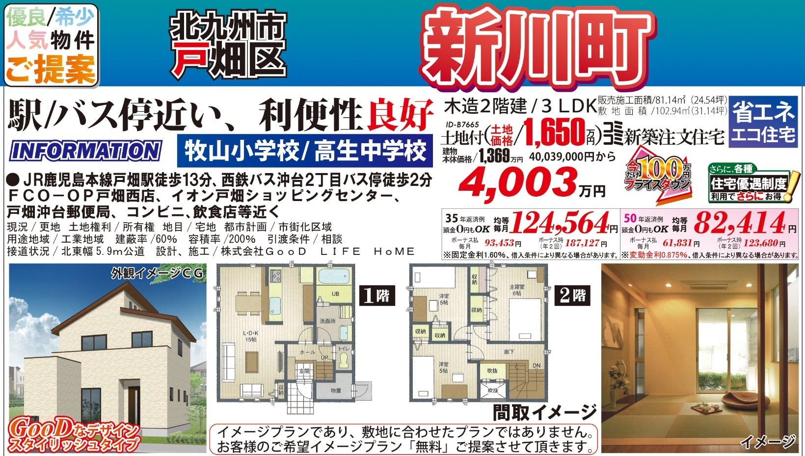 B7665新川町202511 こだわり条件 エリア 価格 校区 こだわり新築住宅 北九州市戸畑区 4,003万円 牧山小 高生中 【販売概要】土地+建物本体+ご提案住宅機器+敷地内上下水道工事+旧住宅基本解体工事+設計確認申請交付+消費税+さらに、オール電化+エコ給湯+ペアサッシ+高気密&高断熱+高耐震+GOODデザイン[含まれて無い物]外構工事+土木擁壁工事+敷地外給排水工事+銀行経費+登記費用+火災保険 この物件について問い合わせ 資料請求・ご質問等ございましたら、お気軽にお問い合わせください。 お名前必須 メールアドレス必須 お電話番号必須 ご住所必須 郵便番号 都道府県 都道府県 北海道 青森県 岩手県 宮城県 秋田県 山形県 福島県 茨城県 栃木県 群馬県 埼玉県 千葉県 東京都 神奈川県 新潟県 富山県 石川県 福井県 山梨県 長野県 岐阜県 静岡県 愛知県 三重県 滋賀県 京都府 大阪府 兵庫県 奈良県 和歌山県 鳥取県 島根県 岡山県 広島県 山口県 徳島県 香川県 愛媛県 高知県 福岡県 佐賀県 長崎県 熊本県 大分県 宮崎県 鹿児島県 沖縄県 市区町村、番地 建物名 郵便番号が入力されていません。 都道府県が選択されていません。 市区町村、番地が入力されていません。 お問い合わせ内容必須