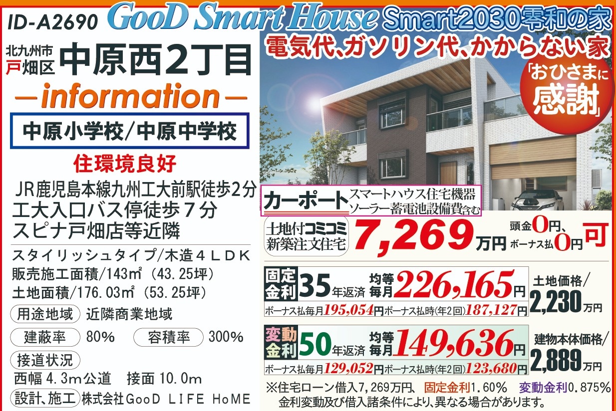 A2690中原西2丁目、スマートハウス202511 こだわり条件 エリア 価格 校区 新エネルギーシステム住宅 北九州市戸畑区 7,269万円 中原小 中原中 【販売概要】土地+建物本体+ご提案住宅機器+敷地内上下水道工事+旧住宅基本解体工事+設計確認申請交付+消費税+さらに、オール電化+エコ給湯+ペアサッシ+高気密&高断熱+高耐震+GOODデザイン[含まれて無い物]外構工事+土木擁壁工事+敷地外給排水工事+銀行経費+登記費用+火災保険 この物件について問い合わせ 資料請求・ご質問等ございましたら、お気軽にお問い合わせください。 お名前必須 メールアドレス必須 お電話番号必須 ご住所必須 郵便番号 都道府県 都道府県 北海道 青森県 岩手県 宮城県 秋田県 山形県 福島県 茨城県 栃木県 群馬県 埼玉県 千葉県 東京都 神奈川県 新潟県 富山県 石川県 福井県 山梨県 長野県 岐阜県 静岡県 愛知県 三重県 滋賀県 京都府 大阪府 兵庫県 奈良県 和歌山県 鳥取県 島根県 岡山県 広島県 山口県 徳島県 香川県 愛媛県 高知県 福岡県 佐賀県 長崎県 熊本県 大分県 宮崎県 鹿児島県 沖縄県 市区町村、番地 建物名 郵便番号が入力されていません。 都道府県が選択されていません。 市区町村、番地が入力されていません。 お問い合わせ内容必須