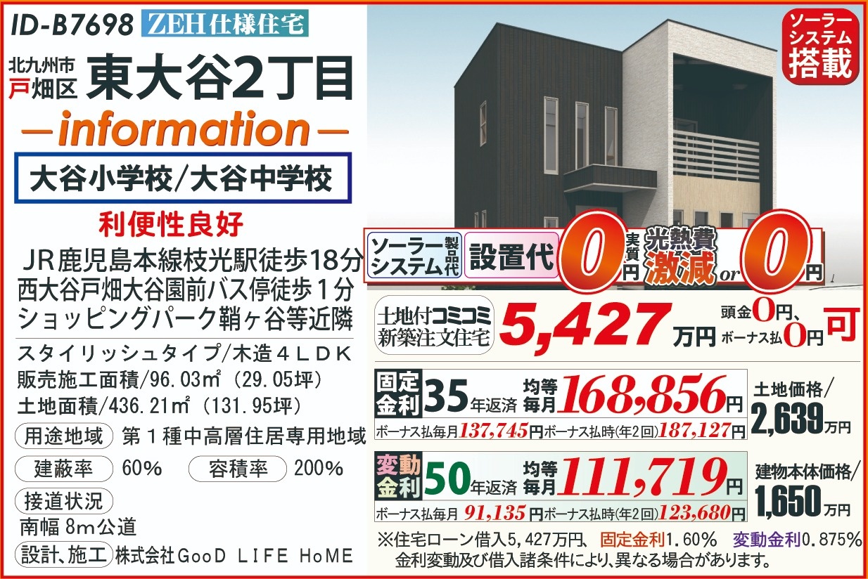 B7698東大谷2丁目、ZEH太陽光202511 こだわり条件 エリア 価格 校区 新エネルギーシステム住宅 北九州市戸畑区 5,427万円 大谷小 大谷中 【販売概要】土地+建物本体+ご提案住宅機器+敷地内上下水道工事+旧住宅基本解体工事+設計確認申請交付+消費税+さらに、オール電化+エコ給湯+ペアサッシ+高気密&高断熱+高耐震+GOODデザイン[含まれて無い物]外構工事+土木擁壁工事+敷地外給排水工事+銀行経費+登記費用+火災保険 この物件について問い合わせ 資料請求・ご質問等ございましたら、お気軽にお問い合わせください。 お名前必須 メールアドレス必須 お電話番号必須 ご住所必須 郵便番号 都道府県 都道府県 北海道 青森県 岩手県 宮城県 秋田県 山形県 福島県 茨城県 栃木県 群馬県 埼玉県 千葉県 東京都 神奈川県 新潟県 富山県 石川県 福井県 山梨県 長野県 岐阜県 静岡県 愛知県 三重県 滋賀県 京都府 大阪府 兵庫県 奈良県 和歌山県 鳥取県 島根県 岡山県 広島県 山口県 徳島県 香川県 愛媛県 高知県 福岡県 佐賀県 長崎県 熊本県 大分県 宮崎県 鹿児島県 沖縄県 市区町村、番地 建物名 郵便番号が入力されていません。 都道府県が選択されていません。 市区町村、番地が入力されていません。 お問い合わせ内容必須