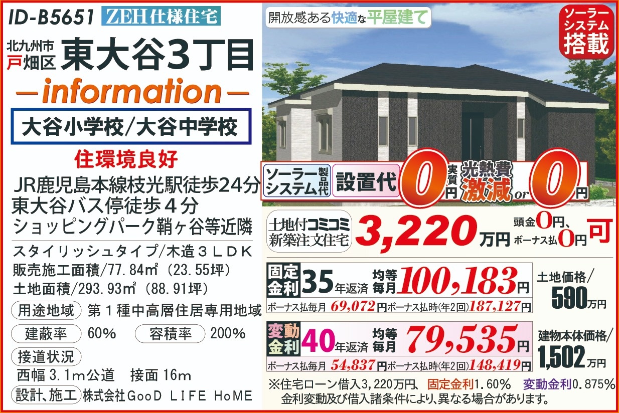 B5651東大谷3丁目、ZEH太陽光平屋建て202511 こだわり条件 エリア 価格 校区 新エネルギーシステム住宅 北九州市戸畑区 3,220万円 大谷小 大谷中 【販売概要】土地+建物本体+ご提案住宅機器+敷地内上下水道工事+旧住宅基本解体工事+設計確認申請交付+消費税+さらに、オール電化+エコ給湯+ペアサッシ+高気密&高断熱+高耐震+GOODデザイン[含まれて無い物]外構工事+土木擁壁工事+敷地外給排水工事+銀行経費+登記費用+火災保険 この物件について問い合わせ 資料請求・ご質問等ございましたら、お気軽にお問い合わせください。 お名前必須 メールアドレス必須 お電話番号必須 ご住所必須 郵便番号 都道府県 都道府県 北海道 青森県 岩手県 宮城県 秋田県 山形県 福島県 茨城県 栃木県 群馬県 埼玉県 千葉県 東京都 神奈川県 新潟県 富山県 石川県 福井県 山梨県 長野県 岐阜県 静岡県 愛知県 三重県 滋賀県 京都府 大阪府 兵庫県 奈良県 和歌山県 鳥取県 島根県 岡山県 広島県 山口県 徳島県 香川県 愛媛県 高知県 福岡県 佐賀県 長崎県 熊本県 大分県 宮崎県 鹿児島県 沖縄県 市区町村、番地 建物名 郵便番号が入力されていません。 都道府県が選択されていません。 市区町村、番地が入力されていません。 お問い合わせ内容必須