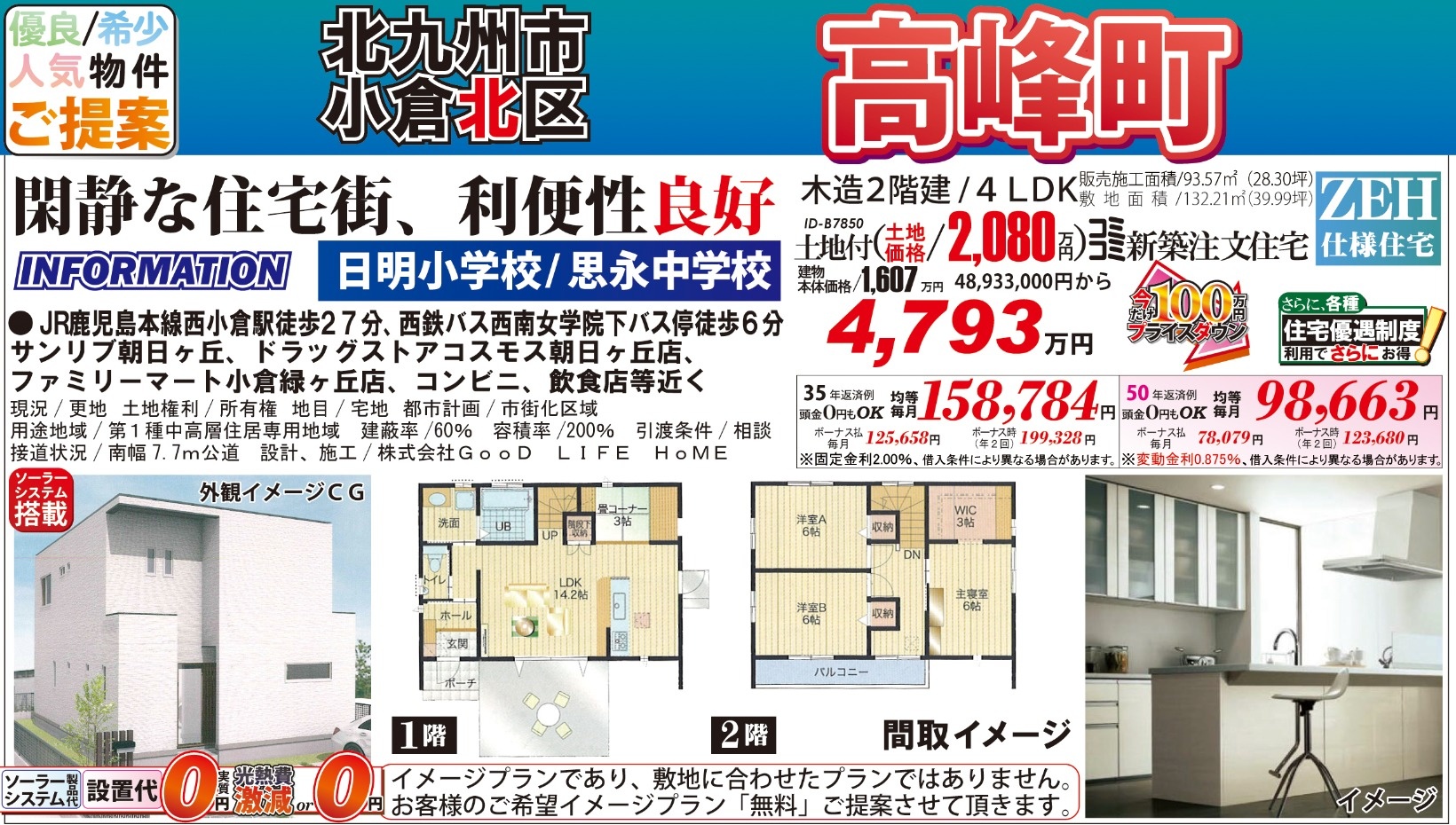 B7850高峰町、ZEH太陽光202603 こだわり条件 エリア 価格 校区 新エネルギーシステム住宅 北九州市小倉北区 4,793万円 日明小 思永中 【販売概要】土地+建物本体+ご提案住宅機器+敷地内上下水道工事+旧住宅基本解体工事+設計確認申請交付+消費税+さらに、オール電化+エコ給湯+ペアサッシ+高気密&高断熱+高耐震+GOODデザイン[含まれて無い物]外構工事+土木擁壁工事+敷地外給排水工事+銀行経費+登記費用+火災保険 この物件について問い合わせ 資料請求・ご質問等ございましたら、お気軽にお問い合わせください。 お名前必須 メールアドレス必須 お電話番号必須 ご住所必須 郵便番号 都道府県 都道府県 北海道 青森県 岩手県 宮城県 秋田県 山形県 福島県 茨城県 栃木県 群馬県 埼玉県 千葉県 東京都 神奈川県 新潟県 富山県 石川県 福井県 山梨県 長野県 岐阜県 静岡県 愛知県 三重県 滋賀県 京都府 大阪府 兵庫県 奈良県 和歌山県 鳥取県 島根県 岡山県 広島県 山口県 徳島県 香川県 愛媛県 高知県 福岡県 佐賀県 長崎県 熊本県 大分県 宮崎県 鹿児島県 沖縄県 市区町村、番地 建物名 郵便番号が入力されていません。 都道府県が選択されていません。 市区町村、番地が入力されていません。 お問い合わせ内容必須