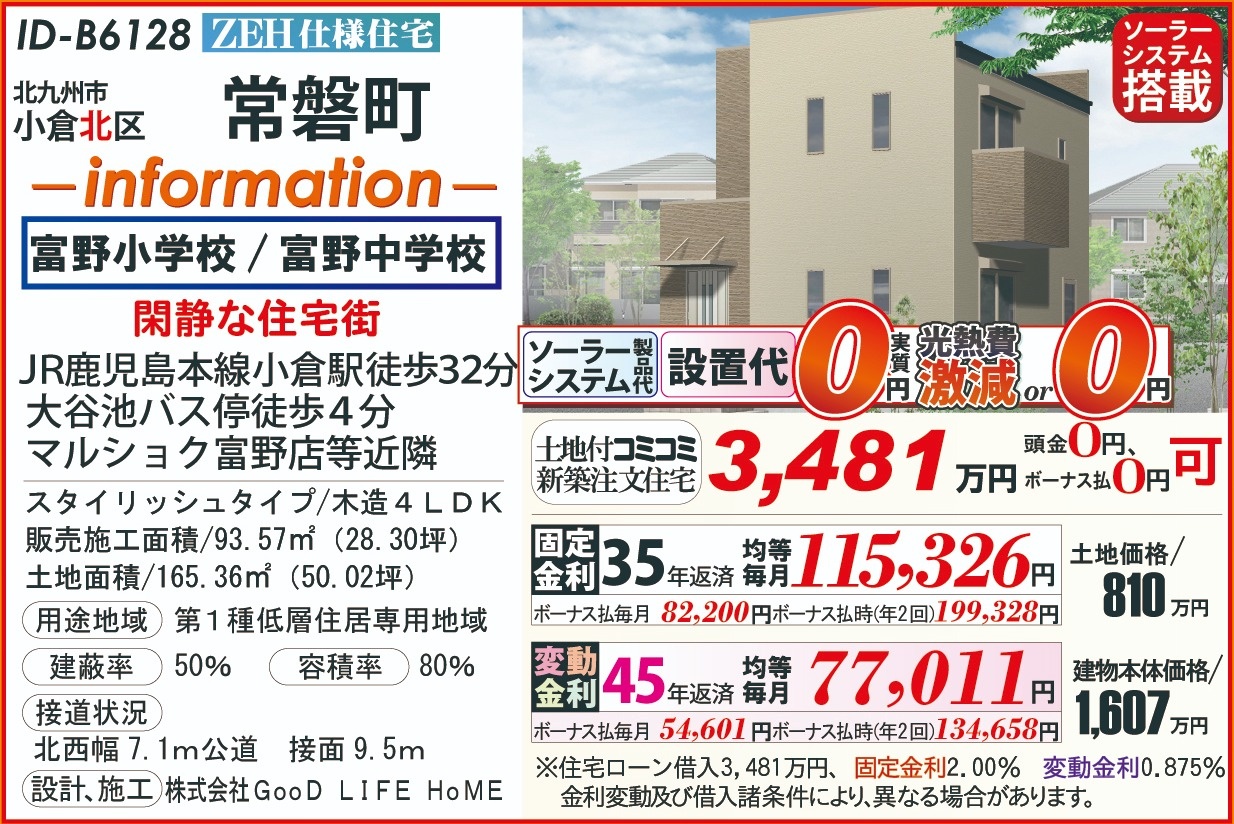 B6128常磐町、ZEH太陽光202603 こだわり条件 エリア 価格 校区 新エネルギーシステム住宅 北九州市小倉北区 3,481万円 富野小 富野中 【販売概要】土地+建物本体+ご提案住宅機器+敷地内上下水道工事+旧住宅基本解体工事+設計確認申請交付+消費税+さらに、オール電化+エコ給湯+ペアサッシ+高気密&高断熱+高耐震+GOODデザイン[含まれて無い物]外構工事+土木擁壁工事+敷地外給排水工事+銀行経費+登記費用+火災保険 この物件について問い合わせ 資料請求・ご質問等ございましたら、お気軽にお問い合わせください。 お名前必須 メールアドレス必須 お電話番号必須 ご住所必須 郵便番号 都道府県 都道府県 北海道 青森県 岩手県 宮城県 秋田県 山形県 福島県 茨城県 栃木県 群馬県 埼玉県 千葉県 東京都 神奈川県 新潟県 富山県 石川県 福井県 山梨県 長野県 岐阜県 静岡県 愛知県 三重県 滋賀県 京都府 大阪府 兵庫県 奈良県 和歌山県 鳥取県 島根県 岡山県 広島県 山口県 徳島県 香川県 愛媛県 高知県 福岡県 佐賀県 長崎県 熊本県 大分県 宮崎県 鹿児島県 沖縄県 市区町村、番地 建物名 郵便番号が入力されていません。 都道府県が選択されていません。 市区町村、番地が入力されていません。 お問い合わせ内容必須