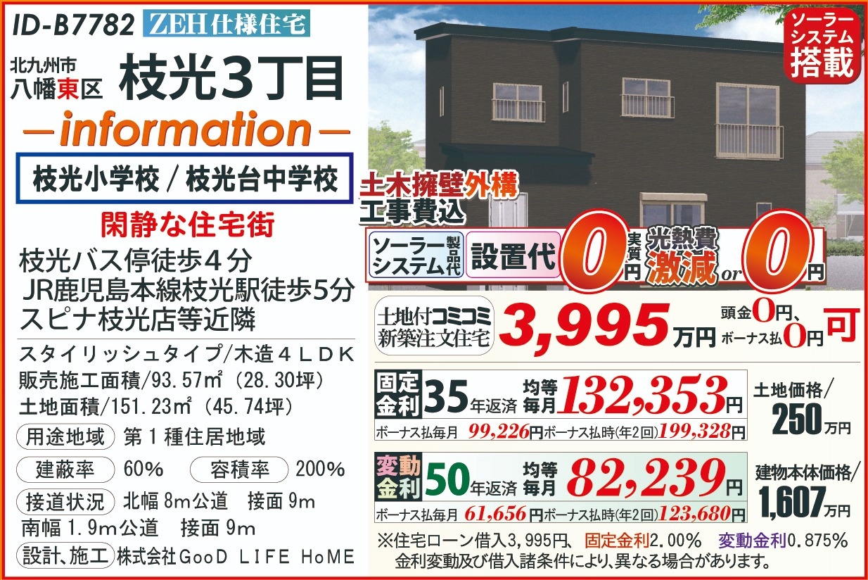 B7782枝光3丁目、ZEH太陽光、土木擁壁外構工事費込202603 こだわり条件 エリア 価格 校区 新エネルギーシステム住宅 北九州市八幡東区 3,995万円 枝光小 枝光台中 【販売概要】土地+建物本体+ご提案住宅機器+敷地内上下水道工事+旧住宅基本解体工事+設計確認申請交付+消費税+さらに、オール電化+エコ給湯+ペアサッシ+高気密&高断熱+高耐震+GOODデザイン[含まれて無い物]外構工事+土木擁壁工事+敷地外給排水工事+銀行経費+登記費用+火災保険 この物件について問い合わせ 資料請求・ご質問等ございましたら、お気軽にお問い合わせください。 お名前必須 メールアドレス必須 お電話番号必須 ご住所必須 郵便番号 都道府県 都道府県 北海道 青森県 岩手県 宮城県 秋田県 山形県 福島県 茨城県 栃木県 群馬県 埼玉県 千葉県 東京都 神奈川県 新潟県 富山県 石川県 福井県 山梨県 長野県 岐阜県 静岡県 愛知県 三重県 滋賀県 京都府 大阪府 兵庫県 奈良県 和歌山県 鳥取県 島根県 岡山県 広島県 山口県 徳島県 香川県 愛媛県 高知県 福岡県 佐賀県 長崎県 熊本県 大分県 宮崎県 鹿児島県 沖縄県 市区町村、番地 建物名 郵便番号が入力されていません。 都道府県が選択されていません。 市区町村、番地が入力されていません。 お問い合わせ内容必須