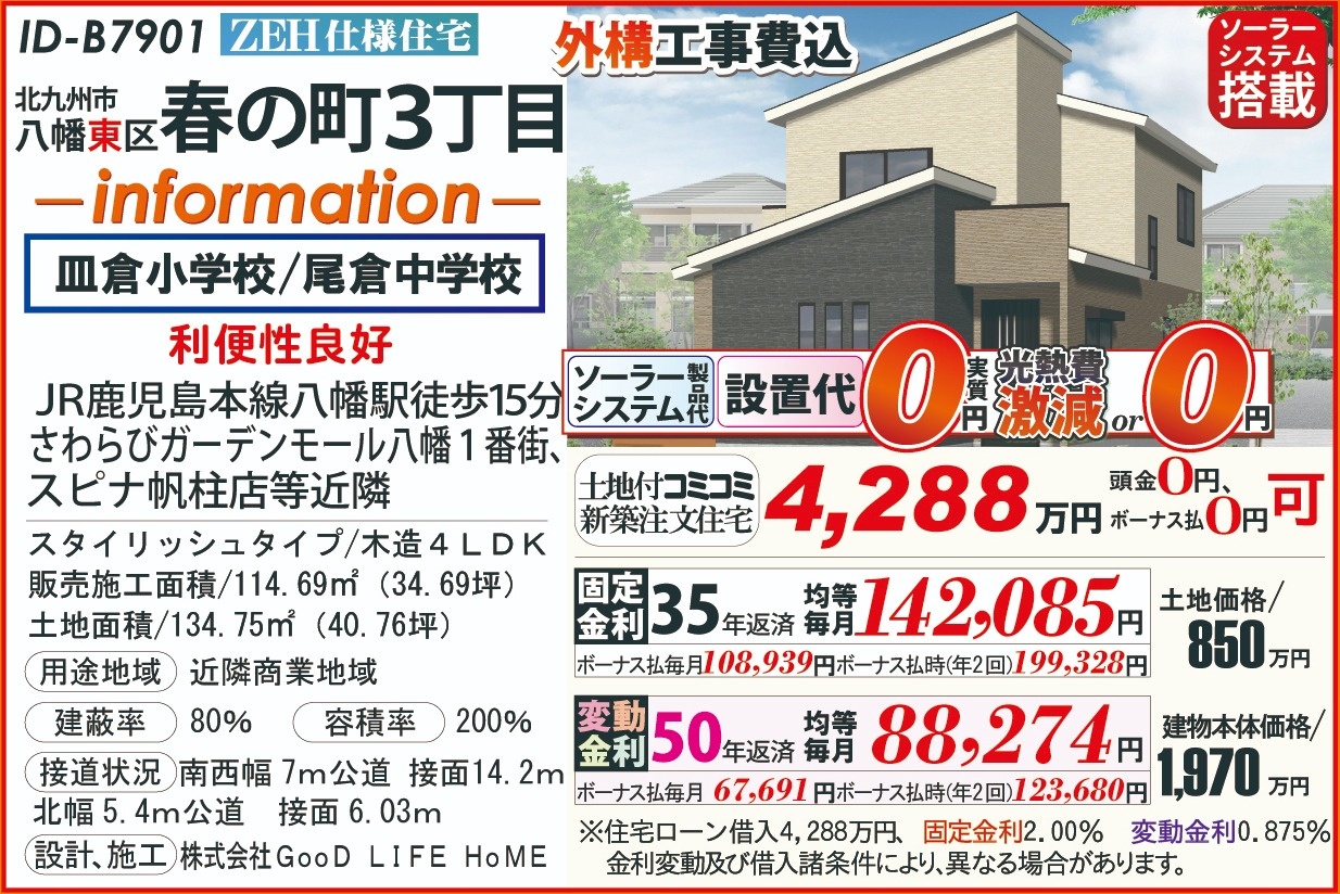 B7901春の町3丁目、ZEH太陽光202603 こだわり条件 エリア 価格 校区 新エネルギーシステム住宅 北九州市八幡東区 4,288万円 皿倉小 尾倉中 【販売概要】土地+建物本体+ご提案住宅機器+敷地内上下水道工事+旧住宅基本解体工事+設計確認申請交付+消費税+さらに、オール電化+エコ給湯+ペアサッシ+高気密&高断熱+高耐震+GOODデザイン[含まれて無い物]外構工事+土木擁壁工事+敷地外給排水工事+銀行経費+登記費用+火災保険 この物件について問い合わせ 資料請求・ご質問等ございましたら、お気軽にお問い合わせください。 お名前必須 メールアドレス必須 お電話番号必須 ご住所必須 郵便番号 都道府県 都道府県 北海道 青森県 岩手県 宮城県 秋田県 山形県 福島県 茨城県 栃木県 群馬県 埼玉県 千葉県 東京都 神奈川県 新潟県 富山県 石川県 福井県 山梨県 長野県 岐阜県 静岡県 愛知県 三重県 滋賀県 京都府 大阪府 兵庫県 奈良県 和歌山県 鳥取県 島根県 岡山県 広島県 山口県 徳島県 香川県 愛媛県 高知県 福岡県 佐賀県 長崎県 熊本県 大分県 宮崎県 鹿児島県 沖縄県 市区町村、番地 建物名 郵便番号が入力されていません。 都道府県が選択されていません。 市区町村、番地が入力されていません。 お問い合わせ内容必須