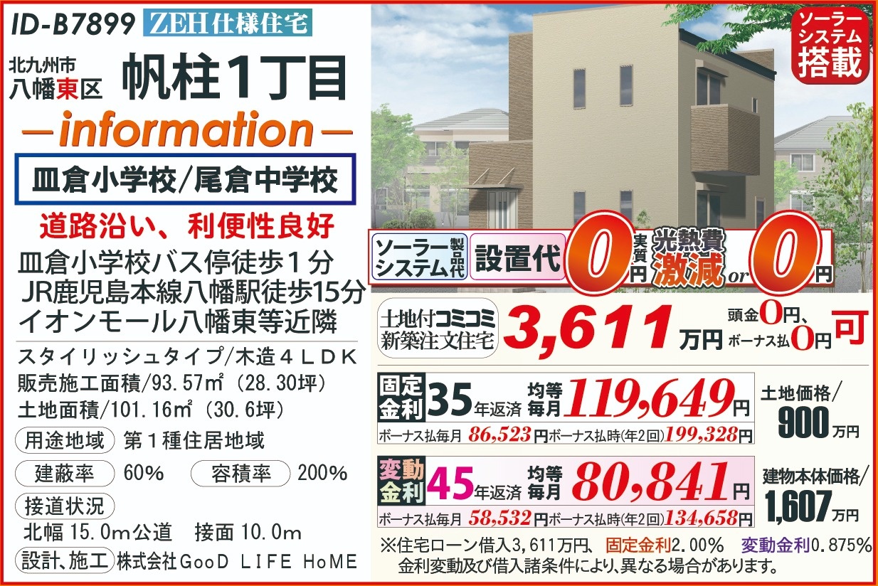 B7899帆柱1丁目、ZEH太陽光202603 こだわり条件 エリア 価格 校区 新エネルギーシステム住宅 北九州市八幡東区 3,611万円 皿倉小 尾倉中 【販売概要】土地+建物本体+ご提案住宅機器+敷地内上下水道工事+旧住宅基本解体工事+設計確認申請交付+消費税+さらに、オール電化+エコ給湯+ペアサッシ+高気密&高断熱+高耐震+GOODデザイン[含まれて無い物]外構工事+土木擁壁工事+敷地外給排水工事+銀行経費+登記費用+火災保険 この物件について問い合わせ 資料請求・ご質問等ございましたら、お気軽にお問い合わせください。 お名前必須 メールアドレス必須 お電話番号必須 ご住所必須 郵便番号 都道府県 都道府県 北海道 青森県 岩手県 宮城県 秋田県 山形県 福島県 茨城県 栃木県 群馬県 埼玉県 千葉県 東京都 神奈川県 新潟県 富山県 石川県 福井県 山梨県 長野県 岐阜県 静岡県 愛知県 三重県 滋賀県 京都府 大阪府 兵庫県 奈良県 和歌山県 鳥取県 島根県 岡山県 広島県 山口県 徳島県 香川県 愛媛県 高知県 福岡県 佐賀県 長崎県 熊本県 大分県 宮崎県 鹿児島県 沖縄県 市区町村、番地 建物名 郵便番号が入力されていません。 都道府県が選択されていません。 市区町村、番地が入力されていません。 お問い合わせ内容必須