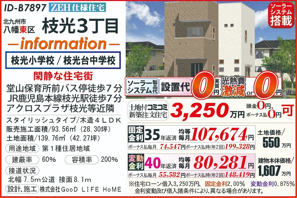 B7897枝光3丁目、ZEH太陽光202603 こだわり条件 エリア 価格 校区 新エネルギーシステム住宅 北九州市八幡東区 3,250万円 枝光小 枝光台中 【販売概要】土地+建物本体+ご提案住宅機器+敷地内上下水道工事+旧住宅基本解体工事+設計確認申請交付+消費税+さらに、オール電化+エコ給湯+ペアサッシ+高気密&高断熱+高耐震+GOODデザイン[含まれて無い物]外構工事+土木擁壁工事+敷地外給排水工事+銀行経費+登記費用+火災保険 この物件について問い合わせ 資料請求・ご質問等ございましたら、お気軽にお問い合わせください。 お名前必須 メールアドレス必須 お電話番号必須 ご住所必須 郵便番号 都道府県 都道府県 北海道 青森県 岩手県 宮城県 秋田県 山形県 福島県 茨城県 栃木県 群馬県 埼玉県 千葉県 東京都 神奈川県 新潟県 富山県 石川県 福井県 山梨県 長野県 岐阜県 静岡県 愛知県 三重県 滋賀県 京都府 大阪府 兵庫県 奈良県 和歌山県 鳥取県 島根県 岡山県 広島県 山口県 徳島県 香川県 愛媛県 高知県 福岡県 佐賀県 長崎県 熊本県 大分県 宮崎県 鹿児島県 沖縄県 市区町村、番地 建物名 郵便番号が入力されていません。 都道府県が選択されていません。 市区町村、番地が入力されていません。 お問い合わせ内容必須