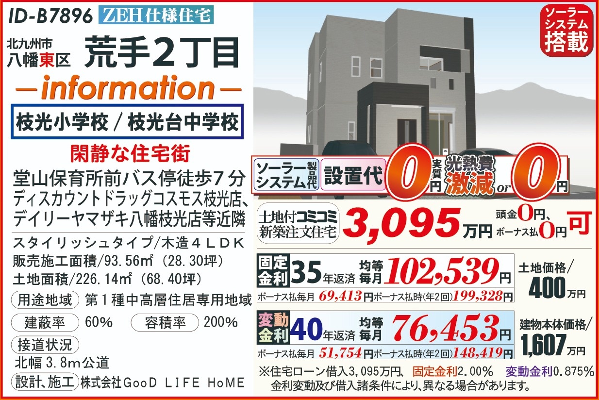 B7896荒手2丁目、ZEH太陽光202603 こだわり条件 エリア 価格 校区 新エネルギーシステム住宅 北九州市八幡東区 3,095万円 枝光小 枝光台中 【販売概要】土地+建物本体+ご提案住宅機器+敷地内上下水道工事+旧住宅基本解体工事+設計確認申請交付+消費税+さらに、オール電化+エコ給湯+ペアサッシ+高気密&高断熱+高耐震+GOODデザイン[含まれて無い物]外構工事+土木擁壁工事+敷地外給排水工事+銀行経費+登記費用+火災保険 この物件について問い合わせ 資料請求・ご質問等ございましたら、お気軽にお問い合わせください。 お名前必須 メールアドレス必須 お電話番号必須 ご住所必須 郵便番号 都道府県 都道府県 北海道 青森県 岩手県 宮城県 秋田県 山形県 福島県 茨城県 栃木県 群馬県 埼玉県 千葉県 東京都 神奈川県 新潟県 富山県 石川県 福井県 山梨県 長野県 岐阜県 静岡県 愛知県 三重県 滋賀県 京都府 大阪府 兵庫県 奈良県 和歌山県 鳥取県 島根県 岡山県 広島県 山口県 徳島県 香川県 愛媛県 高知県 福岡県 佐賀県 長崎県 熊本県 大分県 宮崎県 鹿児島県 沖縄県 市区町村、番地 建物名 郵便番号が入力されていません。 都道府県が選択されていません。 市区町村、番地が入力されていません。 お問い合わせ内容必須