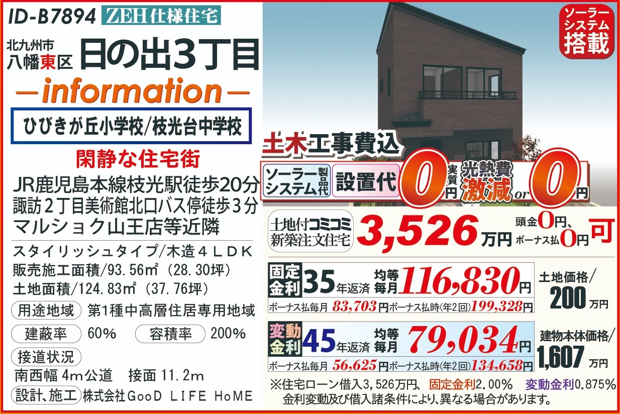 B7894日の出3丁目、ZEH太陽光土木工事費込み202603 こだわり条件 エリア 価格 校区 新エネルギーシステム住宅 北九州市八幡東区 3,526万円 ひびきが丘小 枝光台中 【販売概要】土地+建物本体+ご提案住宅機器+敷地内上下水道工事+旧住宅基本解体工事+設計確認申請交付+消費税+さらに、オール電化+エコ給湯+ペアサッシ+高気密&高断熱+高耐震+GOODデザイン[含まれて無い物]外構工事+土木擁壁工事+敷地外給排水工事+銀行経費+登記費用+火災保険 この物件について問い合わせ 資料請求・ご質問等ございましたら、お気軽にお問い合わせください。 お名前必須 メールアドレス必須 お電話番号必須 ご住所必須 郵便番号 都道府県 都道府県 北海道 青森県 岩手県 宮城県 秋田県 山形県 福島県 茨城県 栃木県 群馬県 埼玉県 千葉県 東京都 神奈川県 新潟県 富山県 石川県 福井県 山梨県 長野県 岐阜県 静岡県 愛知県 三重県 滋賀県 京都府 大阪府 兵庫県 奈良県 和歌山県 鳥取県 島根県 岡山県 広島県 山口県 徳島県 香川県 愛媛県 高知県 福岡県 佐賀県 長崎県 熊本県 大分県 宮崎県 鹿児島県 沖縄県 市区町村、番地 建物名 郵便番号が入力されていません。 都道府県が選択されていません。 市区町村、番地が入力されていません。 お問い合わせ内容必須