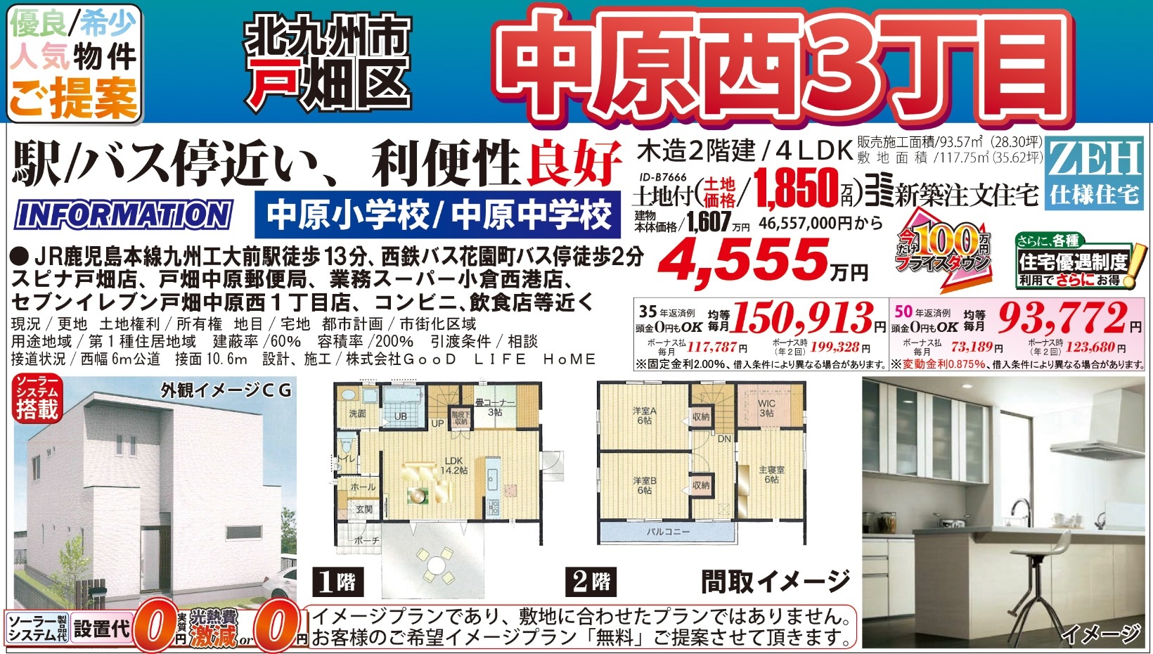 B7666中原西3丁目、ZEH太陽光202603 こだわり条件 エリア 価格 校区 新エネルギーシステム住宅 北九州市戸畑区 4,555万円 中原小 中原中 【販売概要】土地+建物本体+ご提案住宅機器+敷地内上下水道工事+旧住宅基本解体工事+設計確認申請交付+消費税+さらに、オール電化+エコ給湯+ペアサッシ+高気密&高断熱+高耐震+GOODデザイン[含まれて無い物]外構工事+土木擁壁工事+敷地外給排水工事+銀行経費+登記費用+火災保険 この物件について問い合わせ 資料請求・ご質問等ございましたら、お気軽にお問い合わせください。 お名前必須 メールアドレス必須 お電話番号必須 ご住所必須 郵便番号 都道府県 都道府県 北海道 青森県 岩手県 宮城県 秋田県 山形県 福島県 茨城県 栃木県 群馬県 埼玉県 千葉県 東京都 神奈川県 新潟県 富山県 石川県 福井県 山梨県 長野県 岐阜県 静岡県 愛知県 三重県 滋賀県 京都府 大阪府 兵庫県 奈良県 和歌山県 鳥取県 島根県 岡山県 広島県 山口県 徳島県 香川県 愛媛県 高知県 福岡県 佐賀県 長崎県 熊本県 大分県 宮崎県 鹿児島県 沖縄県 市区町村、番地 建物名 郵便番号が入力されていません。 都道府県が選択されていません。 市区町村、番地が入力されていません。 お問い合わせ内容必須