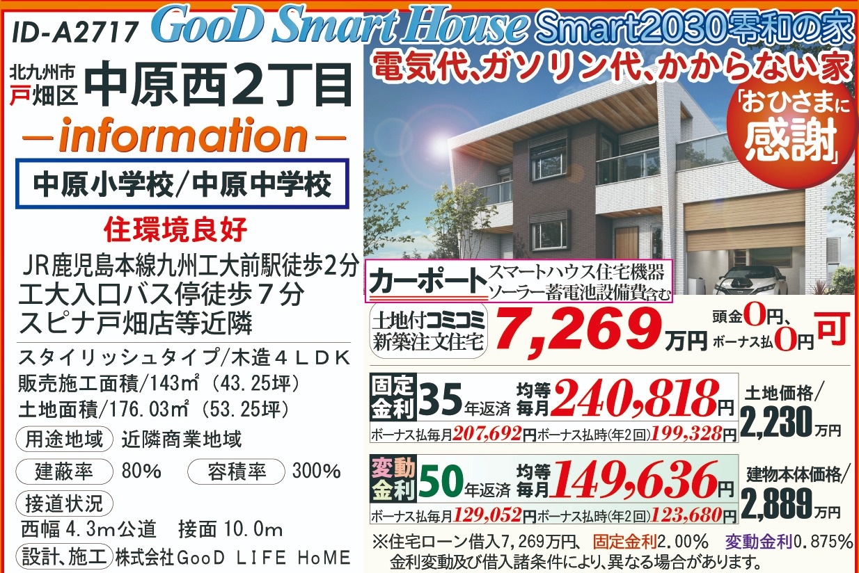 A2717中原西2丁目、スマートハウス202603 こだわり条件 エリア 価格 校区 新エネルギーシステム住宅 北九州市戸畑区 7,269万円 中原小 中原中 【販売概要】土地+建物本体+ご提案住宅機器+敷地内上下水道工事+旧住宅基本解体工事+設計確認申請交付+消費税+さらに、オール電化+エコ給湯+ペアサッシ+高気密&高断熱+高耐震+GOODデザイン[含まれて無い物]外構工事+土木擁壁工事+敷地外給排水工事+銀行経費+登記費用+火災保険 この物件について問い合わせ 資料請求・ご質問等ございましたら、お気軽にお問い合わせください。 お名前必須 メールアドレス必須 お電話番号必須 ご住所必須 郵便番号 都道府県 都道府県 北海道 青森県 岩手県 宮城県 秋田県 山形県 福島県 茨城県 栃木県 群馬県 埼玉県 千葉県 東京都 神奈川県 新潟県 富山県 石川県 福井県 山梨県 長野県 岐阜県 静岡県 愛知県 三重県 滋賀県 京都府 大阪府 兵庫県 奈良県 和歌山県 鳥取県 島根県 岡山県 広島県 山口県 徳島県 香川県 愛媛県 高知県 福岡県 佐賀県 長崎県 熊本県 大分県 宮崎県 鹿児島県 沖縄県 市区町村、番地 建物名 郵便番号が入力されていません。 都道府県が選択されていません。 市区町村、番地が入力されていません。 お問い合わせ内容必須