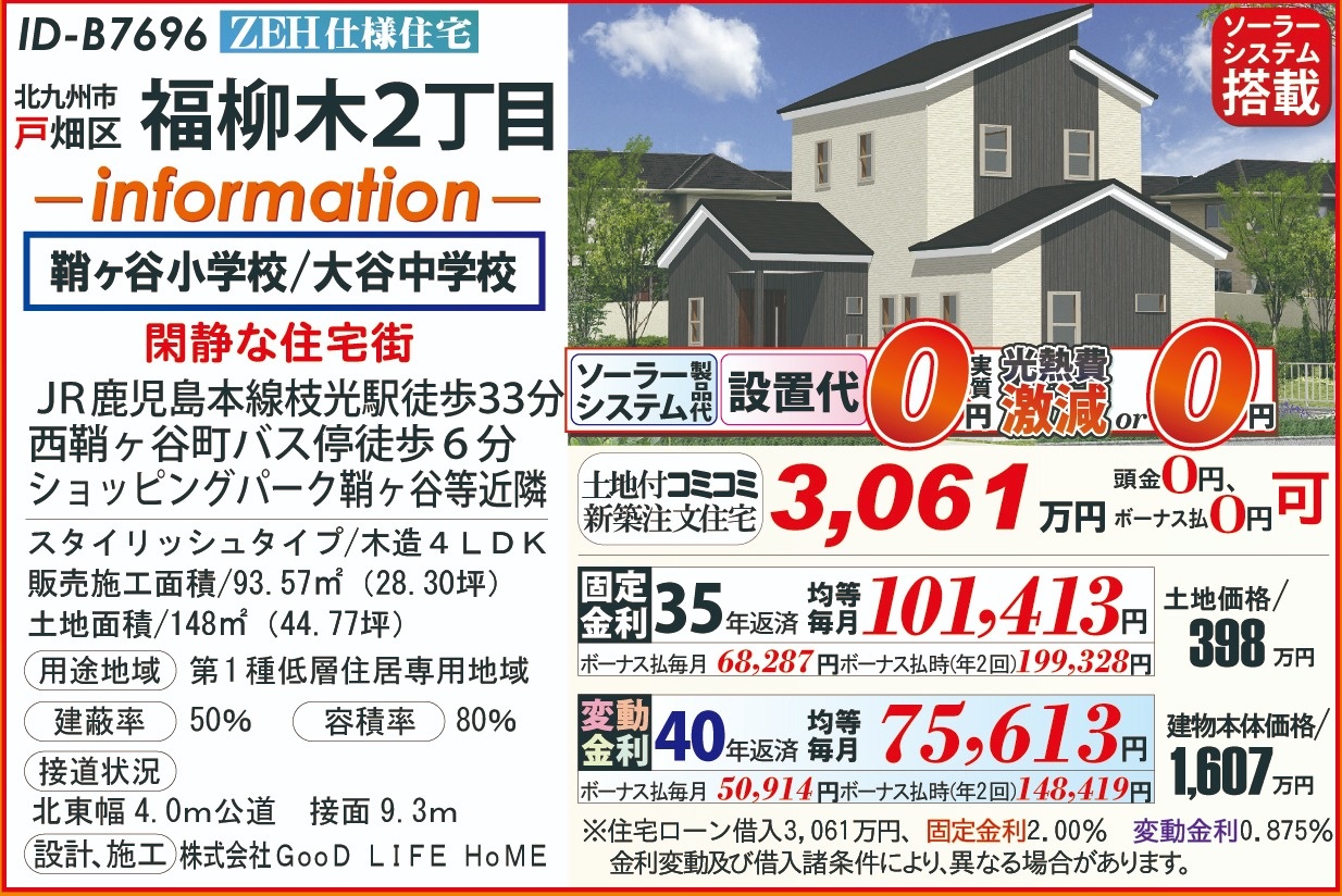 B7696福柳木2丁目、ZEH太陽光202603 こだわり条件 エリア 価格 校区 新エネルギーシステム住宅 北九州市戸畑区 3,061万円 鞘ヶ谷小 大谷中 【販売概要】土地+建物本体+ご提案住宅機器+敷地内上下水道工事+旧住宅基本解体工事+設計確認申請交付+消費税+さらに、オール電化+エコ給湯+ペアサッシ+高気密&高断熱+高耐震+GOODデザイン[含まれて無い物]外構工事+土木擁壁工事+敷地外給排水工事+銀行経費+登記費用+火災保険 この物件について問い合わせ 資料請求・ご質問等ございましたら、お気軽にお問い合わせください。 お名前必須 メールアドレス必須 お電話番号必須 ご住所必須 郵便番号 都道府県 都道府県 北海道 青森県 岩手県 宮城県 秋田県 山形県 福島県 茨城県 栃木県 群馬県 埼玉県 千葉県 東京都 神奈川県 新潟県 富山県 石川県 福井県 山梨県 長野県 岐阜県 静岡県 愛知県 三重県 滋賀県 京都府 大阪府 兵庫県 奈良県 和歌山県 鳥取県 島根県 岡山県 広島県 山口県 徳島県 香川県 愛媛県 高知県 福岡県 佐賀県 長崎県 熊本県 大分県 宮崎県 鹿児島県 沖縄県 市区町村、番地 建物名 郵便番号が入力されていません。 都道府県が選択されていません。 市区町村、番地が入力されていません。 お問い合わせ内容必須
