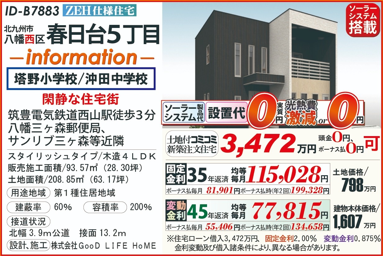B7883春日台5丁目、ZEH太陽光202603 こだわり条件 エリア 価格 校区 新エネルギーシステム住宅 北九州市八幡西区 3,472万円 塔野小 沖田中 【販売概要】土地+建物本体+ご提案住宅機器+敷地内上下水道工事+旧住宅基本解体工事+設計確認申請交付+消費税+さらに、オール電化+エコ給湯+ペアサッシ+高気密&高断熱+高耐震+GOODデザイン[含まれて無い物]外構工事+土木擁壁工事+敷地外給排水工事+銀行経費+登記費用+火災保険 この物件について問い合わせ 資料請求・ご質問等ございましたら、お気軽にお問い合わせください。 お名前必須 メールアドレス必須 お電話番号必須 ご住所必須 郵便番号 都道府県 都道府県 北海道 青森県 岩手県 宮城県 秋田県 山形県 福島県 茨城県 栃木県 群馬県 埼玉県 千葉県 東京都 神奈川県 新潟県 富山県 石川県 福井県 山梨県 長野県 岐阜県 静岡県 愛知県 三重県 滋賀県 京都府 大阪府 兵庫県 奈良県 和歌山県 鳥取県 島根県 岡山県 広島県 山口県 徳島県 香川県 愛媛県 高知県 福岡県 佐賀県 長崎県 熊本県 大分県 宮崎県 鹿児島県 沖縄県 市区町村、番地 建物名 郵便番号が入力されていません。 都道府県が選択されていません。 市区町村、番地が入力されていません。 お問い合わせ内容必須