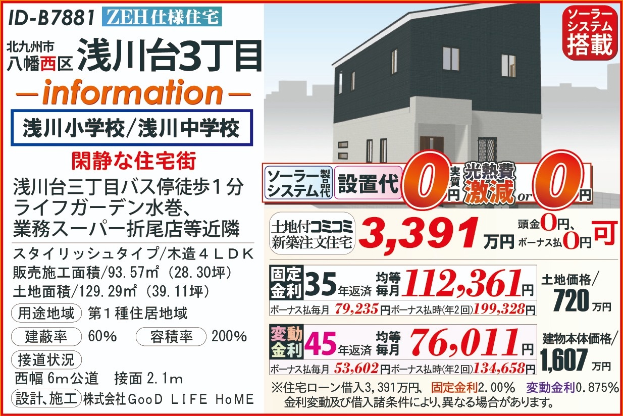 B7881浅川台3丁目、ZEH太陽光202603 こだわり条件 エリア 価格 校区 新エネルギーシステム住宅 北九州市八幡西区 3,391万円 浅川小 浅川中 【販売概要】土地+建物本体+ご提案住宅機器+敷地内上下水道工事+旧住宅基本解体工事+設計確認申請交付+消費税+さらに、オール電化+エコ給湯+ペアサッシ+高気密&高断熱+高耐震+GOODデザイン[含まれて無い物]外構工事+土木擁壁工事+敷地外給排水工事+銀行経費+登記費用+火災保険 この物件について問い合わせ 資料請求・ご質問等ございましたら、お気軽にお問い合わせください。 お名前必須 メールアドレス必須 お電話番号必須 ご住所必須 郵便番号 都道府県 都道府県 北海道 青森県 岩手県 宮城県 秋田県 山形県 福島県 茨城県 栃木県 群馬県 埼玉県 千葉県 東京都 神奈川県 新潟県 富山県 石川県 福井県 山梨県 長野県 岐阜県 静岡県 愛知県 三重県 滋賀県 京都府 大阪府 兵庫県 奈良県 和歌山県 鳥取県 島根県 岡山県 広島県 山口県 徳島県 香川県 愛媛県 高知県 福岡県 佐賀県 長崎県 熊本県 大分県 宮崎県 鹿児島県 沖縄県 市区町村、番地 建物名 郵便番号が入力されていません。 都道府県が選択されていません。 市区町村、番地が入力されていません。 お問い合わせ内容必須