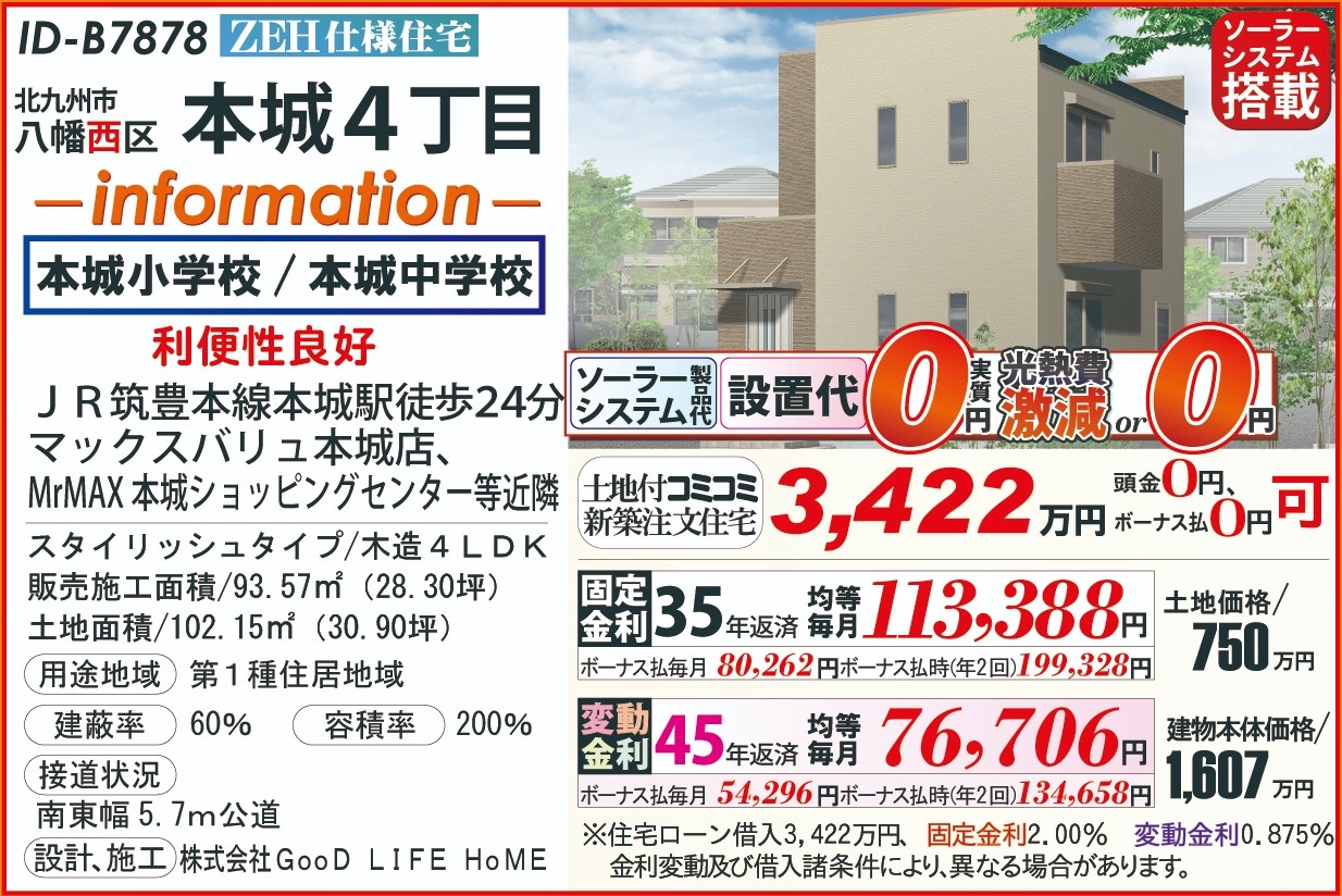B7878本城4丁目、ZEH太陽光202603 こだわり条件 エリア 価格 校区 新エネルギーシステム住宅 北九州市八幡西区 3,422万円 本城小 本城中 【販売概要】土地+建物本体+ご提案住宅機器+敷地内上下水道工事+旧住宅基本解体工事+設計確認申請交付+消費税+さらに、オール電化+エコ給湯+ペアサッシ+高気密&高断熱+高耐震+GOODデザイン[含まれて無い物]外構工事+土木擁壁工事+敷地外給排水工事+銀行経費+登記費用+火災保険 この物件について問い合わせ 資料請求・ご質問等ございましたら、お気軽にお問い合わせください。 お名前必須 メールアドレス必須 お電話番号必須 ご住所必須 郵便番号 都道府県 都道府県 北海道 青森県 岩手県 宮城県 秋田県 山形県 福島県 茨城県 栃木県 群馬県 埼玉県 千葉県 東京都 神奈川県 新潟県 富山県 石川県 福井県 山梨県 長野県 岐阜県 静岡県 愛知県 三重県 滋賀県 京都府 大阪府 兵庫県 奈良県 和歌山県 鳥取県 島根県 岡山県 広島県 山口県 徳島県 香川県 愛媛県 高知県 福岡県 佐賀県 長崎県 熊本県 大分県 宮崎県 鹿児島県 沖縄県 市区町村、番地 建物名 郵便番号が入力されていません。 都道府県が選択されていません。 市区町村、番地が入力されていません。 お問い合わせ内容必須