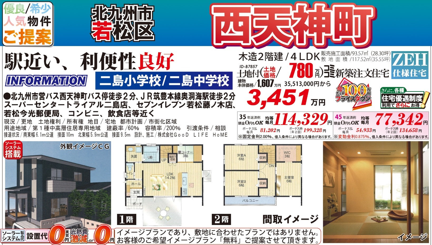 B7857西天神町、ZEH太陽光202603 こだわり条件 エリア 価格 校区 新エネルギーシステム住宅 北九州市若松区 3,451万円 二島小 二島中 【販売概要】土地+建物本体+ご提案住宅機器+敷地内上下水道工事+旧住宅基本解体工事+設計確認申請交付+消費税+さらに、オール電化+エコ給湯+ペアサッシ+高気密&高断熱+高耐震+GOODデザイン[含まれて無い物]外構工事+土木擁壁工事+敷地外給排水工事+銀行経費+登記費用+火災保険 この物件について問い合わせ 資料請求・ご質問等ございましたら、お気軽にお問い合わせください。 お名前必須 メールアドレス必須 お電話番号必須 ご住所必須 郵便番号 都道府県 都道府県 北海道 青森県 岩手県 宮城県 秋田県 山形県 福島県 茨城県 栃木県 群馬県 埼玉県 千葉県 東京都 神奈川県 新潟県 富山県 石川県 福井県 山梨県 長野県 岐阜県 静岡県 愛知県 三重県 滋賀県 京都府 大阪府 兵庫県 奈良県 和歌山県 鳥取県 島根県 岡山県 広島県 山口県 徳島県 香川県 愛媛県 高知県 福岡県 佐賀県 長崎県 熊本県 大分県 宮崎県 鹿児島県 沖縄県 市区町村、番地 建物名 郵便番号が入力されていません。 都道府県が選択されていません。 市区町村、番地が入力されていません。 お問い合わせ内容必須