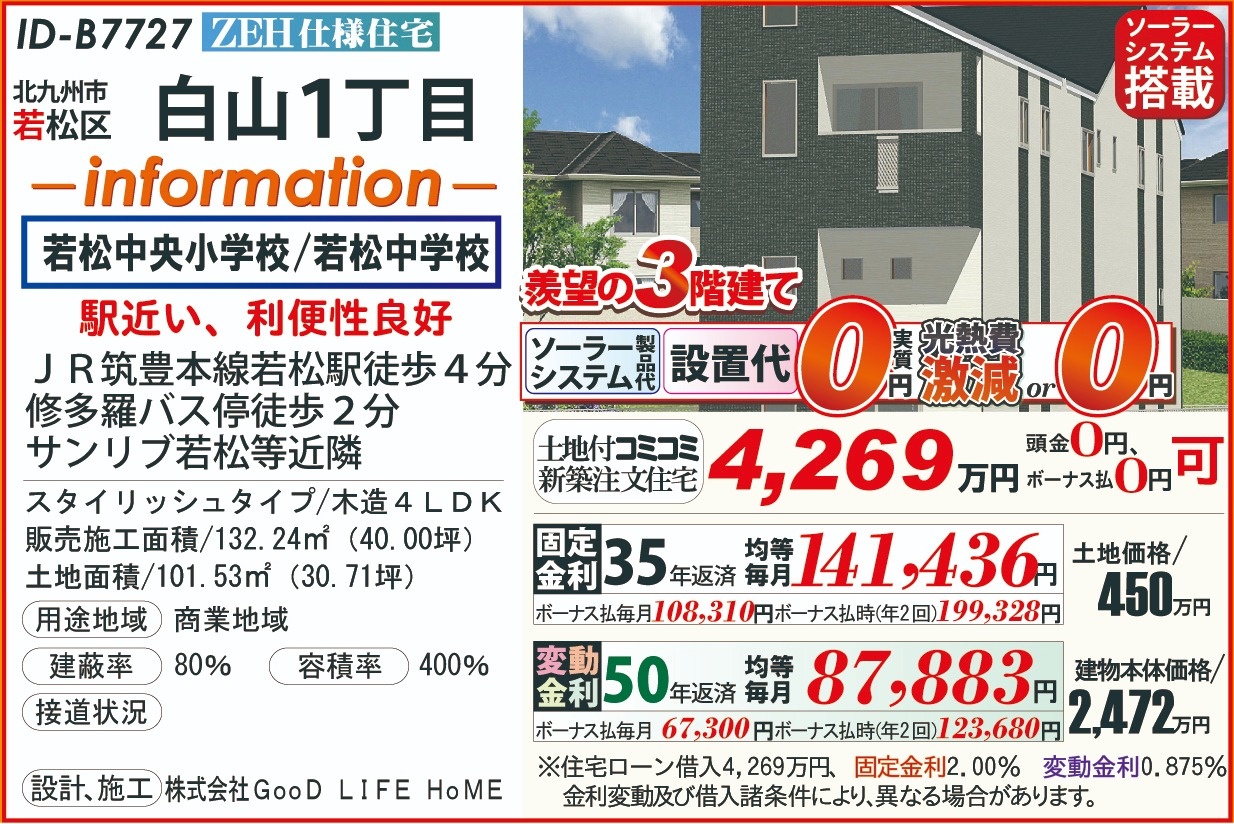 B7727白山1丁目、ZEH太陽光、三階建て202603 こだわり条件 エリア 価格 校区 新エネルギーシステム住宅 北九州市若松区 4,269万円 若松中央小 若松中 【販売概要】土地+建物本体+ご提案住宅機器+敷地内上下水道工事+旧住宅基本解体工事+設計確認申請交付+消費税+さらに、オール電化+エコ給湯+ペアサッシ+高気密&高断熱+高耐震+GOODデザイン[含まれて無い物]外構工事+土木擁壁工事+敷地外給排水工事+銀行経費+登記費用+火災保険 この物件について問い合わせ 資料請求・ご質問等ございましたら、お気軽にお問い合わせください。 お名前必須 メールアドレス必須 お電話番号必須 ご住所必須 郵便番号 都道府県 都道府県 北海道 青森県 岩手県 宮城県 秋田県 山形県 福島県 茨城県 栃木県 群馬県 埼玉県 千葉県 東京都 神奈川県 新潟県 富山県 石川県 福井県 山梨県 長野県 岐阜県 静岡県 愛知県 三重県 滋賀県 京都府 大阪府 兵庫県 奈良県 和歌山県 鳥取県 島根県 岡山県 広島県 山口県 徳島県 香川県 愛媛県 高知県 福岡県 佐賀県 長崎県 熊本県 大分県 宮崎県 鹿児島県 沖縄県 市区町村、番地 建物名 郵便番号が入力されていません。 都道府県が選択されていません。 市区町村、番地が入力されていません。 お問い合わせ内容必須