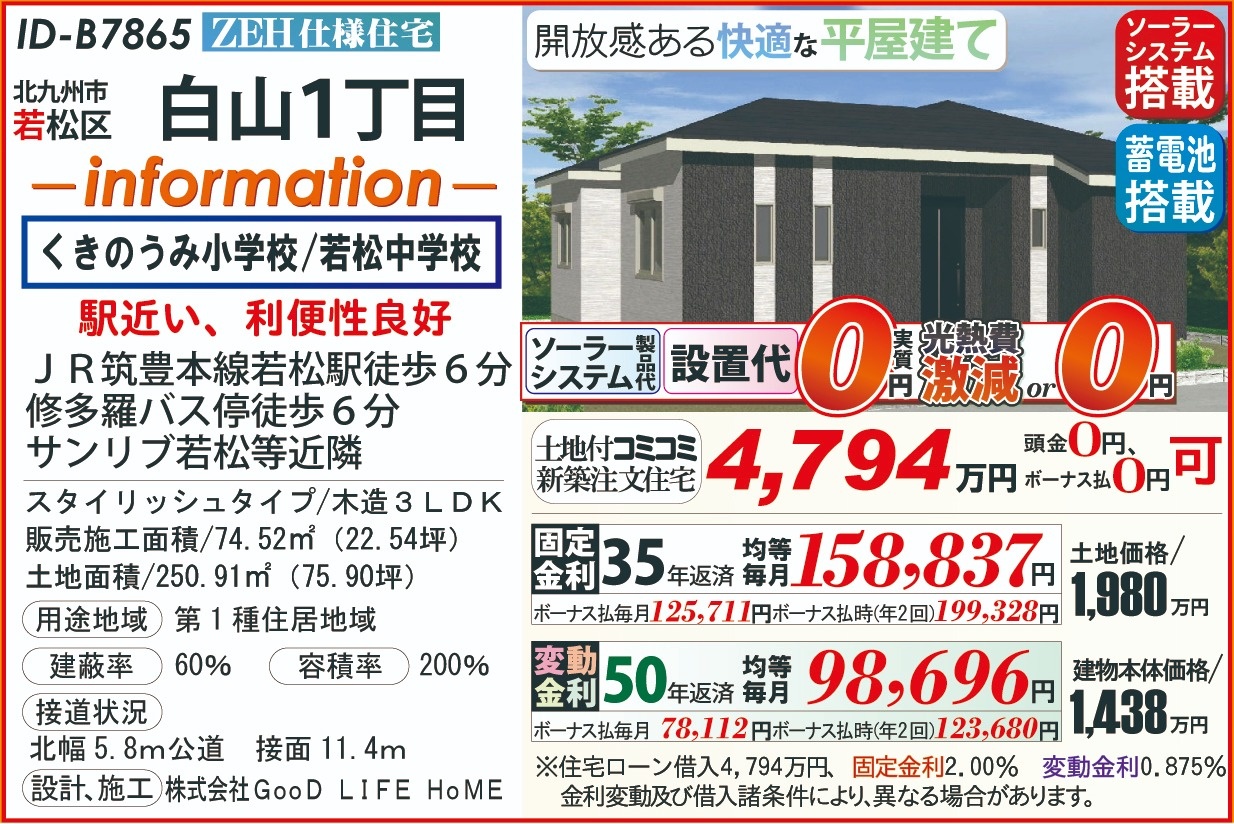 B7865白山1丁目、ZEH太陽光、蓄電池、平屋202603 こだわり条件 エリア 価格 校区 新エネルギーシステム住宅 北九州市若松区 4,794万円 くきのうみ小 若松中 【販売概要】土地+建物本体+ご提案住宅機器+敷地内上下水道工事+旧住宅基本解体工事+設計確認申請交付+消費税+さらに、オール電化+エコ給湯+ペアサッシ+高気密&高断熱+高耐震+GOODデザイン[含まれて無い物]外構工事+土木擁壁工事+敷地外給排水工事+銀行経費+登記費用+火災保険 この物件について問い合わせ 資料請求・ご質問等ございましたら、お気軽にお問い合わせください。 お名前必須 メールアドレス必須 お電話番号必須 ご住所必須 郵便番号 都道府県 都道府県 北海道 青森県 岩手県 宮城県 秋田県 山形県 福島県 茨城県 栃木県 群馬県 埼玉県 千葉県 東京都 神奈川県 新潟県 富山県 石川県 福井県 山梨県 長野県 岐阜県 静岡県 愛知県 三重県 滋賀県 京都府 大阪府 兵庫県 奈良県 和歌山県 鳥取県 島根県 岡山県 広島県 山口県 徳島県 香川県 愛媛県 高知県 福岡県 佐賀県 長崎県 熊本県 大分県 宮崎県 鹿児島県 沖縄県 市区町村、番地 建物名 郵便番号が入力されていません。 都道府県が選択されていません。 市区町村、番地が入力されていません。 お問い合わせ内容必須