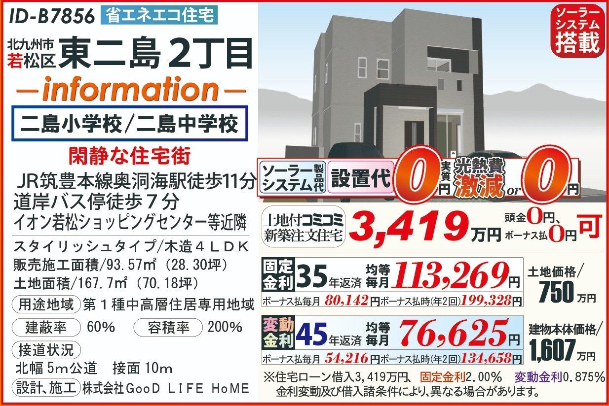 B7856東二島2丁目、ZEH太陽光202603 こだわり条件 エリア 価格 校区 新エネルギーシステム住宅 北九州市若松区 3,419万円 二島小 二島中 【販売概要】土地+建物本体+ご提案住宅機器+敷地内上下水道工事+旧住宅基本解体工事+設計確認申請交付+消費税+さらに、オール電化+エコ給湯+ペアサッシ+高気密&高断熱+高耐震+GOODデザイン[含まれて無い物]外構工事+土木擁壁工事+敷地外給排水工事+銀行経費+登記費用+火災保険 この物件について問い合わせ 資料請求・ご質問等ございましたら、お気軽にお問い合わせください。 お名前必須 メールアドレス必須 お電話番号必須 ご住所必須 郵便番号 都道府県 都道府県 北海道 青森県 岩手県 宮城県 秋田県 山形県 福島県 茨城県 栃木県 群馬県 埼玉県 千葉県 東京都 神奈川県 新潟県 富山県 石川県 福井県 山梨県 長野県 岐阜県 静岡県 愛知県 三重県 滋賀県 京都府 大阪府 兵庫県 奈良県 和歌山県 鳥取県 島根県 岡山県 広島県 山口県 徳島県 香川県 愛媛県 高知県 福岡県 佐賀県 長崎県 熊本県 大分県 宮崎県 鹿児島県 沖縄県 市区町村、番地 建物名 郵便番号が入力されていません。 都道府県が選択されていません。 市区町村、番地が入力されていません。 お問い合わせ内容必須