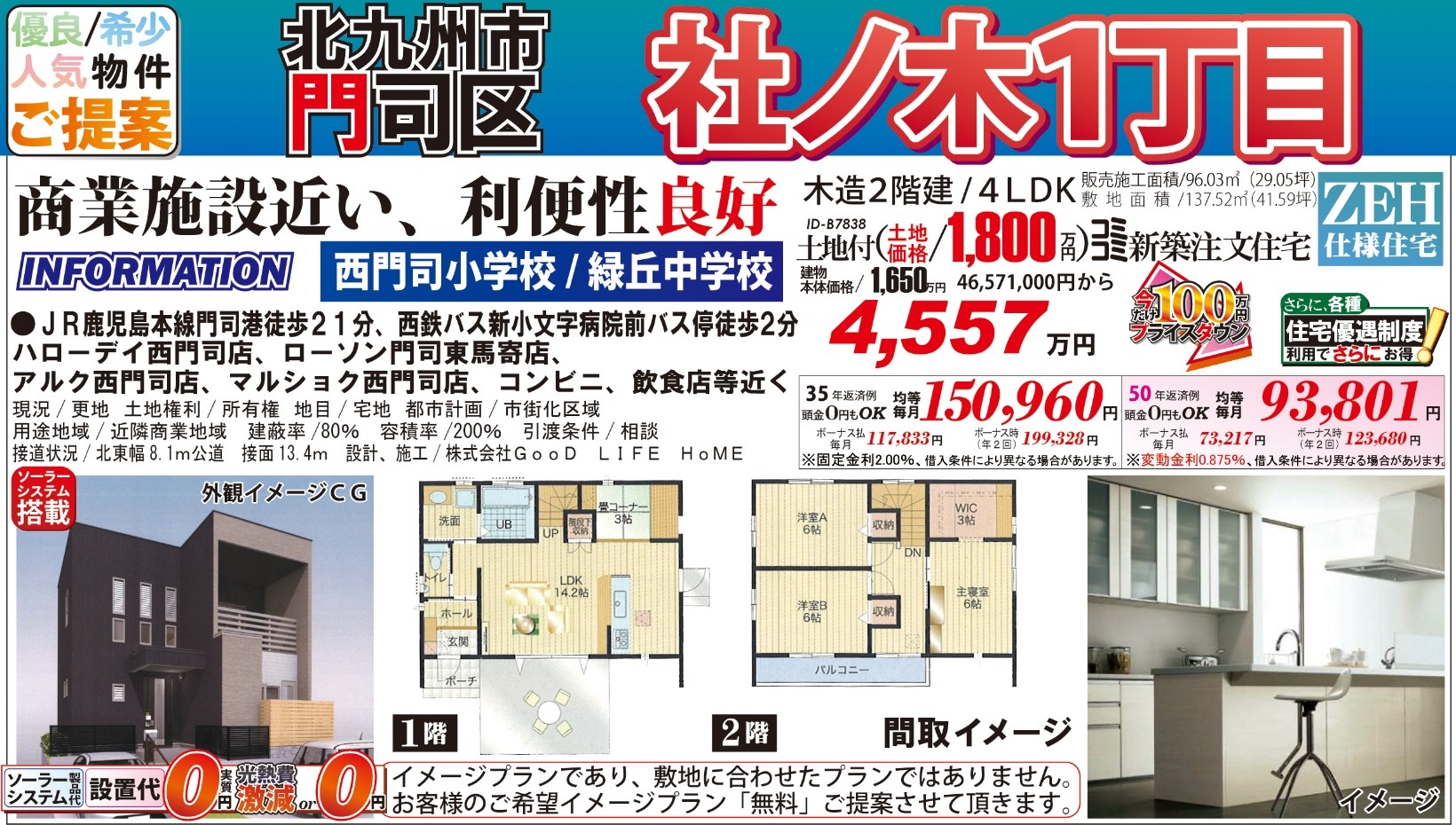 B7838社ノ木1丁目、ZEH太陽光202603 こだわり条件 エリア 価格 校区 新エネルギーシステム住宅 北九州市門司区 4,557万円 西門司小 緑丘中 【販売概要】土地+建物本体+ご提案住宅機器+敷地内上下水道工事+旧住宅基本解体工事+設計確認申請交付+消費税+さらに、オール電化+エコ給湯+ペアサッシ+高気密&高断熱+高耐震+GOODデザイン[含まれて無い物]外構工事+土木擁壁工事+敷地外給排水工事+銀行経費+登記費用+火災保険 この物件について問い合わせ 資料請求・ご質問等ございましたら、お気軽にお問い合わせください。 お名前必須 メールアドレス必須 お電話番号必須 ご住所必須 郵便番号 都道府県 都道府県 北海道 青森県 岩手県 宮城県 秋田県 山形県 福島県 茨城県 栃木県 群馬県 埼玉県 千葉県 東京都 神奈川県 新潟県 富山県 石川県 福井県 山梨県 長野県 岐阜県 静岡県 愛知県 三重県 滋賀県 京都府 大阪府 兵庫県 奈良県 和歌山県 鳥取県 島根県 岡山県 広島県 山口県 徳島県 香川県 愛媛県 高知県 福岡県 佐賀県 長崎県 熊本県 大分県 宮崎県 鹿児島県 沖縄県 市区町村、番地 建物名 郵便番号が入力されていません。 都道府県が選択されていません。 市区町村、番地が入力されていません。 お問い合わせ内容必須