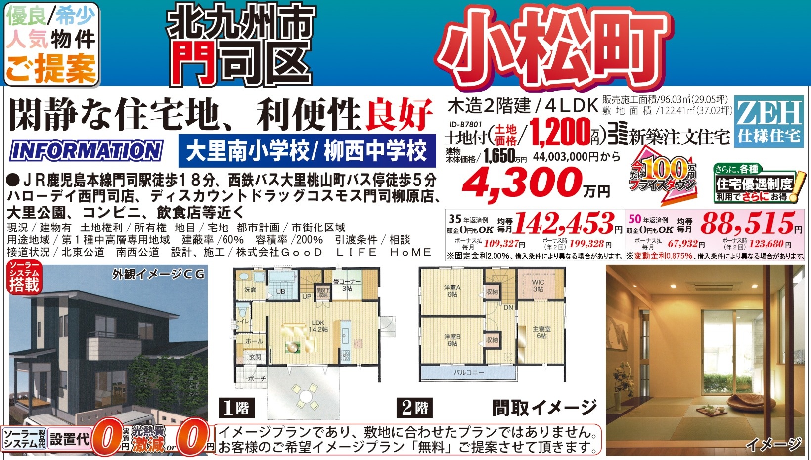 B7801小松町、ZEH太陽光202603 こだわり条件 エリア 価格 校区 新エネルギーシステム住宅 北九州市門司区 4,300万円 大里南小 柳西中 【販売概要】土地+建物本体+ご提案住宅機器+敷地内上下水道工事+旧住宅基本解体工事+設計確認申請交付+消費税+さらに、オール電化+エコ給湯+ペアサッシ+高気密&高断熱+高耐震+GOODデザイン[含まれて無い物]外構工事+土木擁壁工事+敷地外給排水工事+銀行経費+登記費用+火災保険 この物件について問い合わせ 資料請求・ご質問等ございましたら、お気軽にお問い合わせください。 お名前必須 メールアドレス必須 お電話番号必須 ご住所必須 郵便番号 都道府県 都道府県 北海道 青森県 岩手県 宮城県 秋田県 山形県 福島県 茨城県 栃木県 群馬県 埼玉県 千葉県 東京都 神奈川県 新潟県 富山県 石川県 福井県 山梨県 長野県 岐阜県 静岡県 愛知県 三重県 滋賀県 京都府 大阪府 兵庫県 奈良県 和歌山県 鳥取県 島根県 岡山県 広島県 山口県 徳島県 香川県 愛媛県 高知県 福岡県 佐賀県 長崎県 熊本県 大分県 宮崎県 鹿児島県 沖縄県 市区町村、番地 建物名 郵便番号が入力されていません。 都道府県が選択されていません。 市区町村、番地が入力されていません。 お問い合わせ内容必須