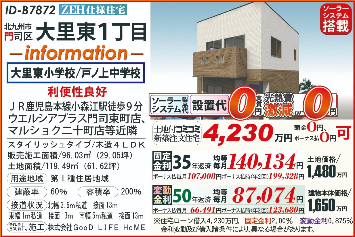 B7872大里東1丁目、ZEH太陽光202603 こだわり条件 エリア 価格 校区 新エネルギーシステム住宅 北九州市門司区 4,230万円 大里東小 戸ノ上中 【販売概要】土地+建物本体+ご提案住宅機器+敷地内上下水道工事+旧住宅基本解体工事+設計確認申請交付+消費税+さらに、オール電化+エコ給湯+ペアサッシ+高気密&高断熱+高耐震+GOODデザイン[含まれて無い物]外構工事+土木擁壁工事+敷地外給排水工事+銀行経費+登記費用+火災保険 この物件について問い合わせ 資料請求・ご質問等ございましたら、お気軽にお問い合わせください。 お名前必須 メールアドレス必須 お電話番号必須 ご住所必須 郵便番号 都道府県 都道府県 北海道 青森県 岩手県 宮城県 秋田県 山形県 福島県 茨城県 栃木県 群馬県 埼玉県 千葉県 東京都 神奈川県 新潟県 富山県 石川県 福井県 山梨県 長野県 岐阜県 静岡県 愛知県 三重県 滋賀県 京都府 大阪府 兵庫県 奈良県 和歌山県 鳥取県 島根県 岡山県 広島県 山口県 徳島県 香川県 愛媛県 高知県 福岡県 佐賀県 長崎県 熊本県 大分県 宮崎県 鹿児島県 沖縄県 市区町村、番地 建物名 郵便番号が入力されていません。 都道府県が選択されていません。 市区町村、番地が入力されていません。 お問い合わせ内容必須
