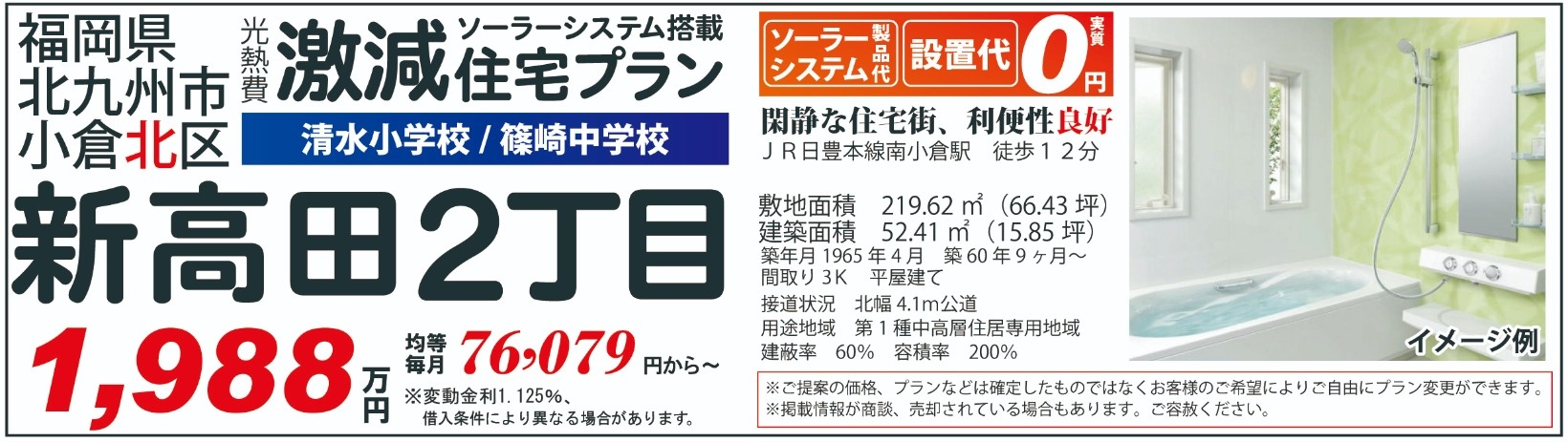 新高田2丁目リノベーション202602 エリア 価格 校区 北九州市小倉北区 1,988万円 清水小 篠崎中 ※ご提案の価格、プランなどは確定したものではなくお客様のご希望によりご自由にプラン変更ができます。 ※掲載情報が商談、売却されている場合もあります。ご容赦ください。 この物件について問い合わせ 資料請求・ご質問等ございましたら、お気軽にお問い合わせください。 お名前必須 メールアドレス必須 お電話番号必須 ご住所必須 郵便番号 都道府県 都道府県 北海道 青森県 岩手県 宮城県 秋田県 山形県 福島県 茨城県 栃木県 群馬県 埼玉県 千葉県 東京都 神奈川県 新潟県 富山県 石川県 福井県 山梨県 長野県 岐阜県 静岡県 愛知県 三重県 滋賀県 京都府 大阪府 兵庫県 奈良県 和歌山県 鳥取県 島根県 岡山県 広島県 山口県 徳島県 香川県 愛媛県 高知県 福岡県 佐賀県 長崎県 熊本県 大分県 宮崎県 鹿児島県 沖縄県 市区町村、番地 建物名 郵便番号が入力されていません。 都道府県が選択されていません。 市区町村、番地が入力されていません。 お問い合わせ内容必須