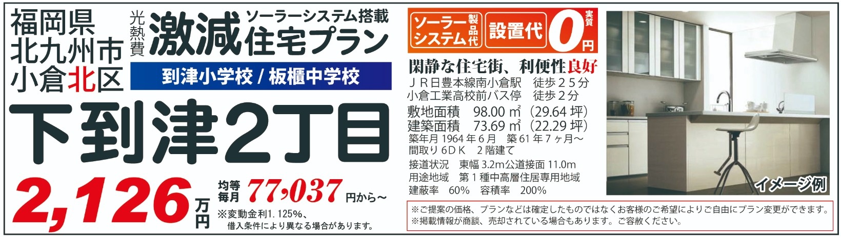 下到津2丁目リノベーション202602 エリア 価格 校区 北九州市小倉北区 2,126万円 到津小 板櫃中 ※ご提案の価格、プランなどは確定したものではなくお客様のご希望によりご自由にプラン変更ができます。 ※掲載情報が商談、売却されている場合もあります。ご容赦ください。 この物件について問い合わせ 資料請求・ご質問等ございましたら、お気軽にお問い合わせください。 お名前必須 メールアドレス必須 お電話番号必須 ご住所必須 郵便番号 都道府県 都道府県 北海道 青森県 岩手県 宮城県 秋田県 山形県 福島県 茨城県 栃木県 群馬県 埼玉県 千葉県 東京都 神奈川県 新潟県 富山県 石川県 福井県 山梨県 長野県 岐阜県 静岡県 愛知県 三重県 滋賀県 京都府 大阪府 兵庫県 奈良県 和歌山県 鳥取県 島根県 岡山県 広島県 山口県 徳島県 香川県 愛媛県 高知県 福岡県 佐賀県 長崎県 熊本県 大分県 宮崎県 鹿児島県 沖縄県 市区町村、番地 建物名 郵便番号が入力されていません。 都道府県が選択されていません。 市区町村、番地が入力されていません。 お問い合わせ内容必須